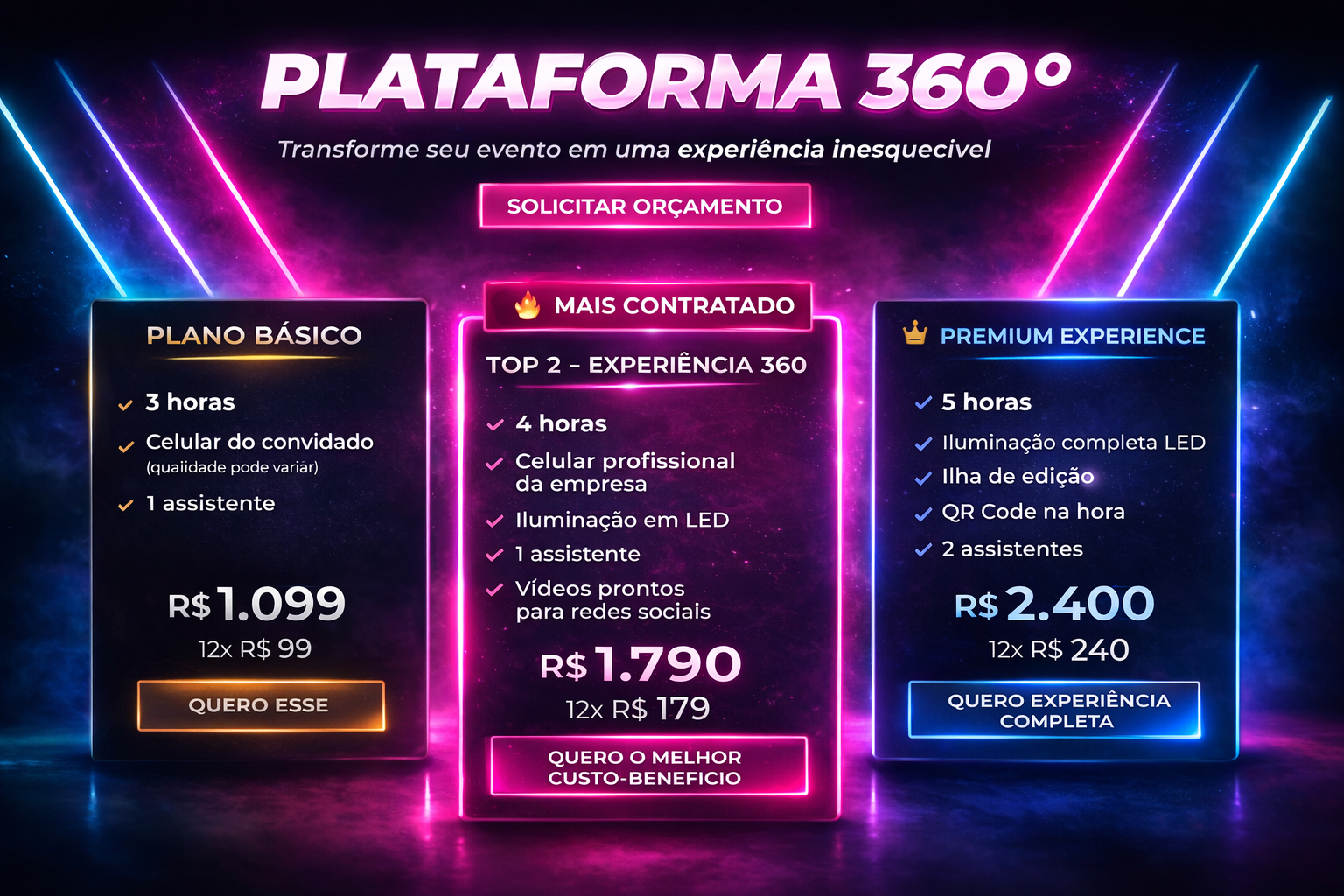 Proporciona uma experiência única e imersiva na sua festa. Ao subir na Plataforma, os convidados conseguirão capturar o ambiente em 360 graus, com giros e camera lenta para deixar ainda mais incrível.